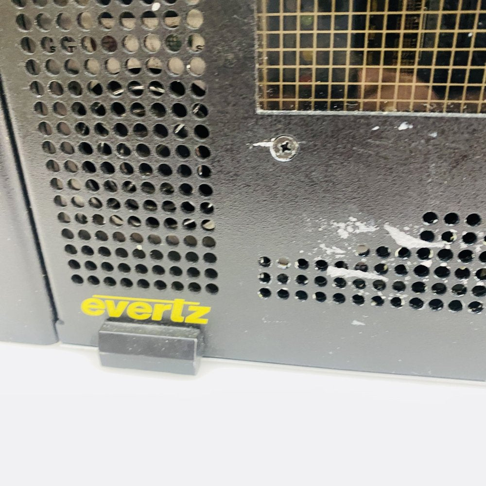 Broadcast video equipment job lot comprising an Evertz 7800FR-QT quiet multiframe chassis (3RU) populated with three Evertz 7707VR-4 receiver cards, a wired camera joystick controller with mounting clamp and a J-LAB Co. BPDA-1 video distribution amplifier. The J-LAB unit is supplied without its power supply. The Evertz chassis is a modular 16‑slot frame with network and serial management I/O and accepts Evertz 7000‑series cards (installed cards shown).