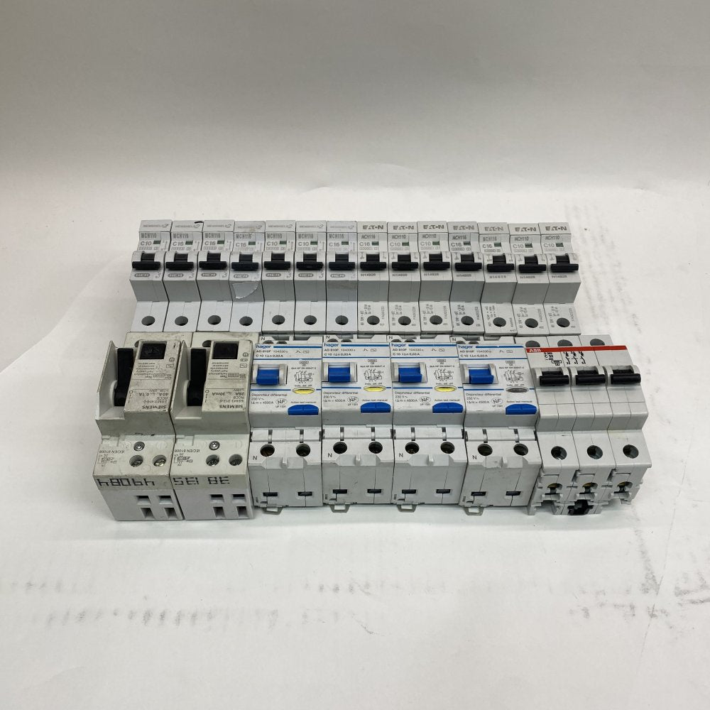 The Industrial Circuit Breaker Lot includes a variety of components designed for high-performance securing of electrical systems. This assortment, ideal for both commercial and industrial installations, ensures reliable circuit protection with renowned brands such as Hager, Siemens, and ABB.